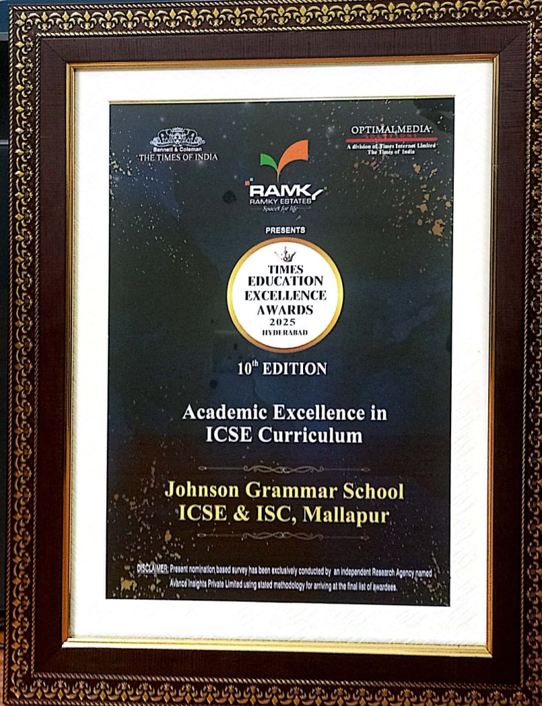 Johnson Grammar School, ICSE & ISC, Mallapur has been honoured with the prestigious “Special Jury Award” by ET-Tech X for the academic year 2024-2025 in recognition of the school’s outstanding achievements in Advancing Education through creativity and cutting-edge technology, as well as promoting academic excellence with student-focused initiatives